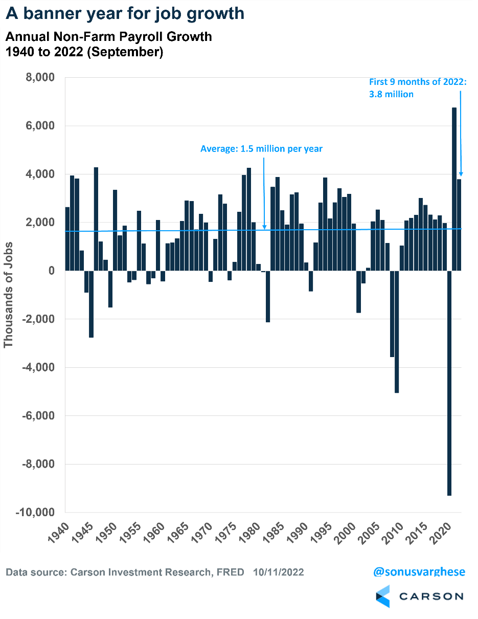 Payroll growth has certainly slowed over the last few months, from 537,000 in July to 315,000 in August and then 263,000 in September. But make no mistake: These are robust numbers, and the big picture is that 3.8 million jobs were created over the first nine months of 2022.