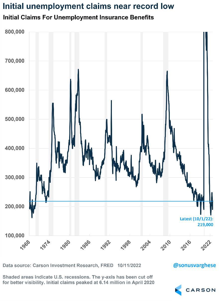 This is a popular leading indicator of the labor market that’s released weekly. Historically, a rise in initial claims for unemployment insurance benefits foreshadows a rise in the unemployment rate. Initial claims are currently drifting close to record lows (the latest was 219,000 as of Oct 1st). Even better news is the fact that “continuing claims” are around 1.36 million – the lowest level since the late 1960s and well below the pre-pandemic level of 1.8 million. Indicating that laid-off workers who file initial claims are quickly able to find a job, without continuing to receive unemployment insurance.