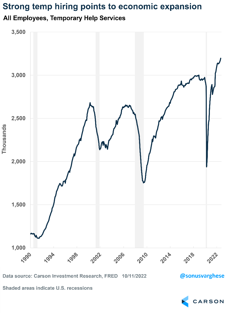 This may be one you haven’t seen before, but it’s one I like to keep an eye on as a leading indicator for employment. Over the last few decades, employers have increasingly relied on temps to fulfill staffing needs, giving them more flexibility.
