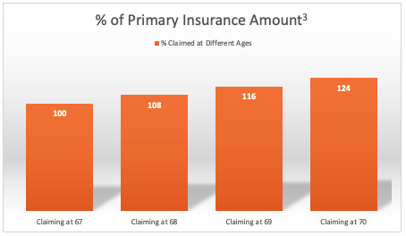 If this widow’s benefit is expected to be greater than her deceased spouse’s benefit, she could begin collecting survivor benefits at age 60. Then, to maximize here own benefits, if she waits till after her FRA—to 68, 69, or 70 to start collecting—she increases her monthly take-home significantly—up to 24% more! (See image3.) (This doesn’t apply to survivor benefits. Survivor benefits are capped at 100% at FRA.)