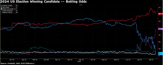 President Joe Biden withdrew from the 2024 presidential race and endorsed Vice President Kamala Harris as the Democratic nominee, although the endorsement does not necessarily mean she will win the nomination. The change in the Democratic ticket does not change our fundamental view of the election, which we discussed at length in our recently released Midyear Outlook 2024: Eyes on the Prize.