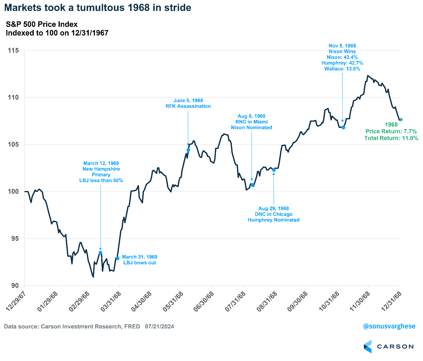 The S&P 500 price index actually rallied 15% from March 31st (when President Johnson announced he wouldn’t run) through the end of the year. The index gained 7.7% over the entire year, and 11% in total return terms. That’s slightly above the long-term annual average. Almost like the political tumult didn’t matter.