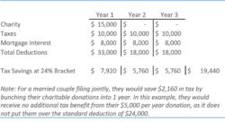 Even if you do not have a big income event, you may want to consider “bunching” your donations every couple of years. Many people who previously itemized their deductions are now using the increased standard deduction. For example, if you don’t think you will be over the standard deduction with your normal yearly gifting, you may want to donate 3-5 years’ worth of donations into the donor-advised fund in the current year. You can then take advantage of the itemized deduction in the high-donation year, take the standard deduction in the subsequent years, and disburse the funds to charities over the next three to five years ratably as you typically would on a yearly basis.