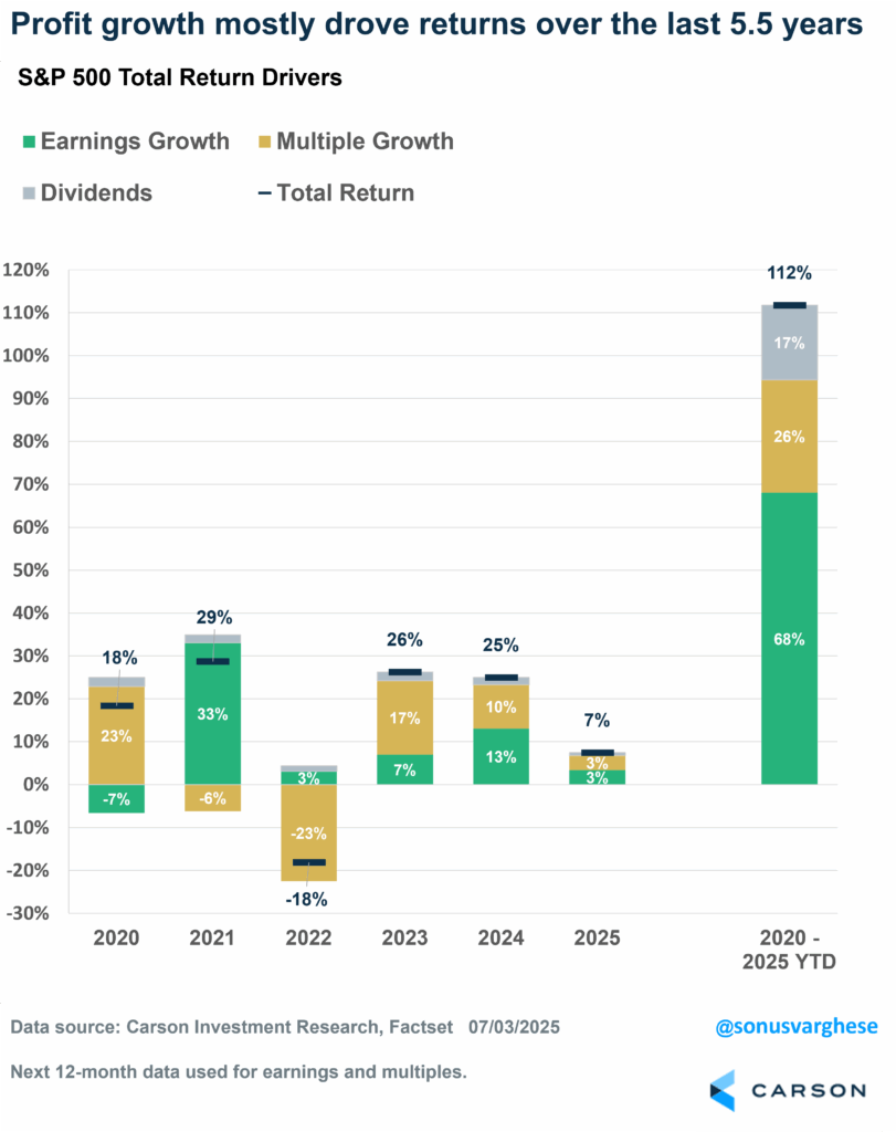 In short, 4.1%-points of the index’s YTD return in 2025 came from profits, both retained and distributed (dividends). Zooming back over the past 5 years (2020-2025 to date), the S&P 500 has gained 112%, which we can break down to: