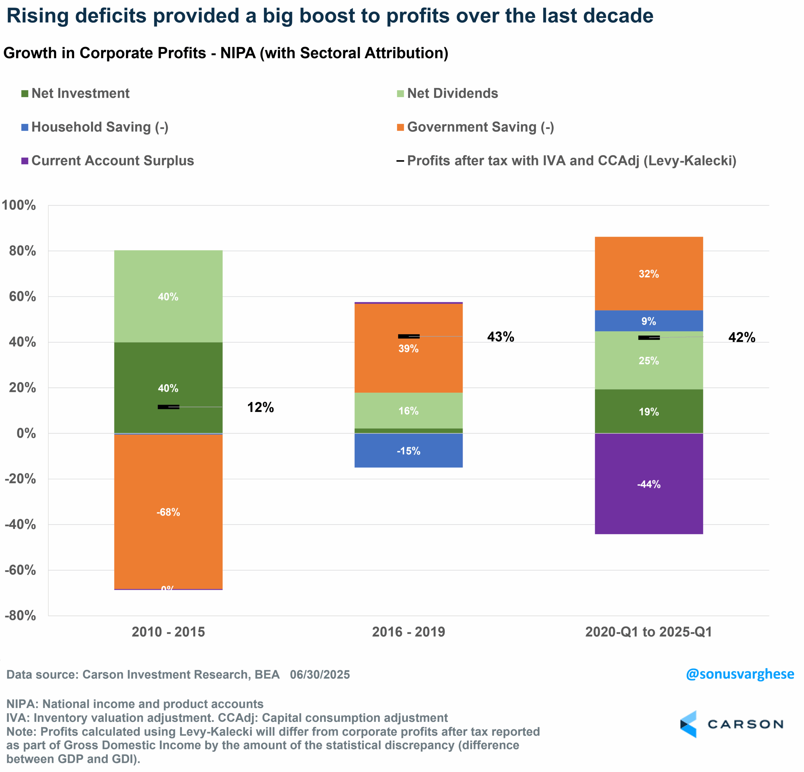 - 2020 Q1–2021 Q2: Profit growth was given a huge boost by massive fiscal deficits during the post-Covid era, adding to profit drivers like increased household spending and investment. This more than overcame the drag from surging trade deficits.