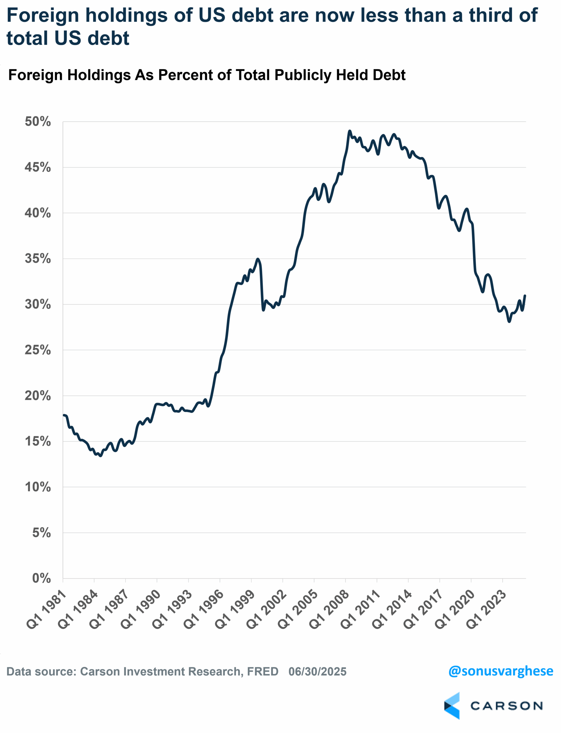 Foreign holdings of U.S. Treasury debt as a percent of overall U.S. debt have been declining over the last decade—dropping from 45–50% to about 30%. This is partly because of massive debt issuance post-Covid, most of which has been gobbled up by the U.S. private sector, albeit at higher interest rates (everyone likes their high-yield savings accounts and money markets). The other reason is that a lot of foreign inflows went toward purchasing U.S. equities, which have had an amazing decade of returns.