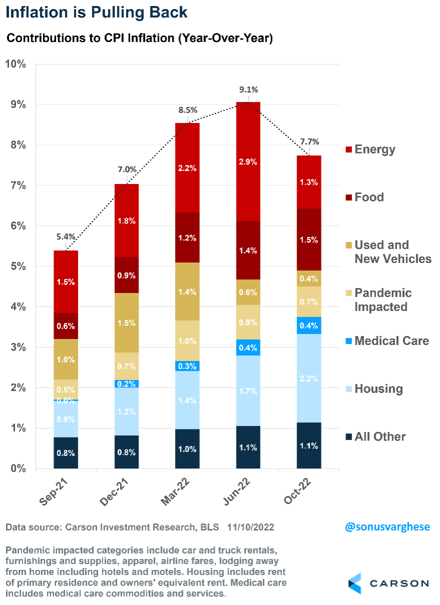 Headline inflation is up 7.8% over the past year. That’s high, but it has come down from 9.1% in June. The deceleration stems largely from falling energy prices. As the chart below shows, the lighter red bars have accounted for a smaller portion of inflation over the past few months.
