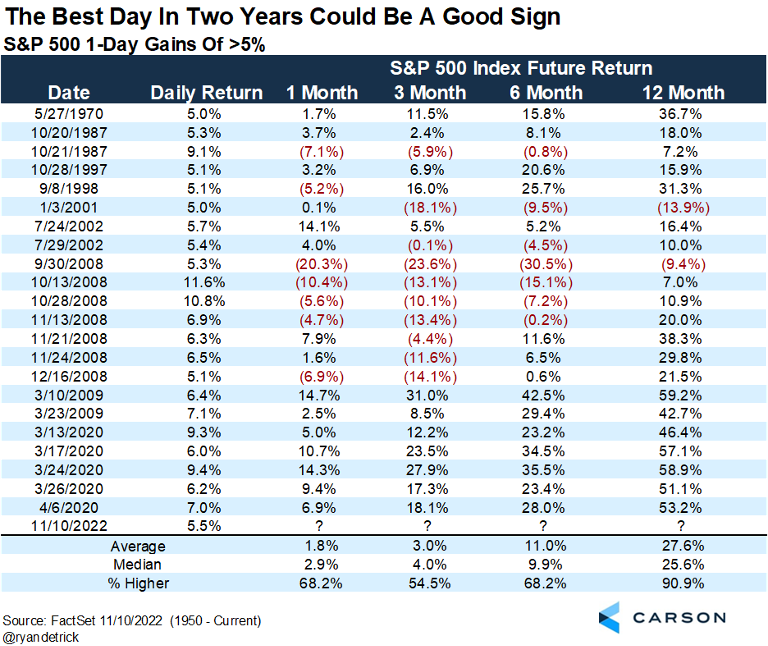 The softer-than-expected core inflation print was the catalyst for the S&P 500 Index gaining 5.5% on the day the inflation report was released, marking its best day since April 2020. The chart below shows some historical perspective for days that saw more than 5% gains. One year later, markets were up 91% of the time, with an average return of almost 28%.