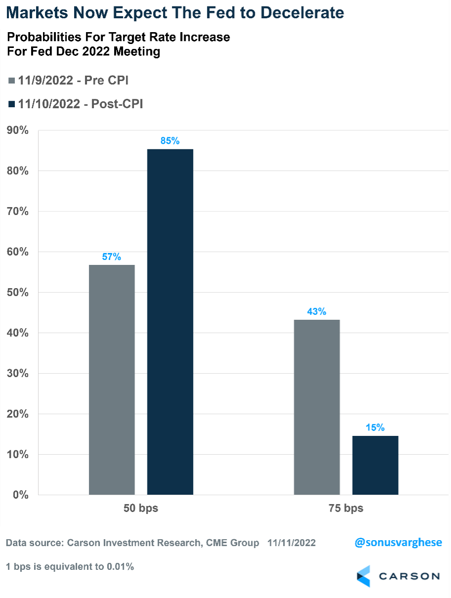 Two, it buys time for the Fed. If this was yet another hot inflation print, that would have put enormous pressure on the Fed to go for a 75 bps (0.75%) increase in December. But now it looks like a 50 bps increase is the most likely scenario, assuming the November CPI report doesn’t surprise us by coming in hot. Investor expectations have shifted significantly. The probability of a 50 bps hike has gone from a near coin flip (57%) to 85%.