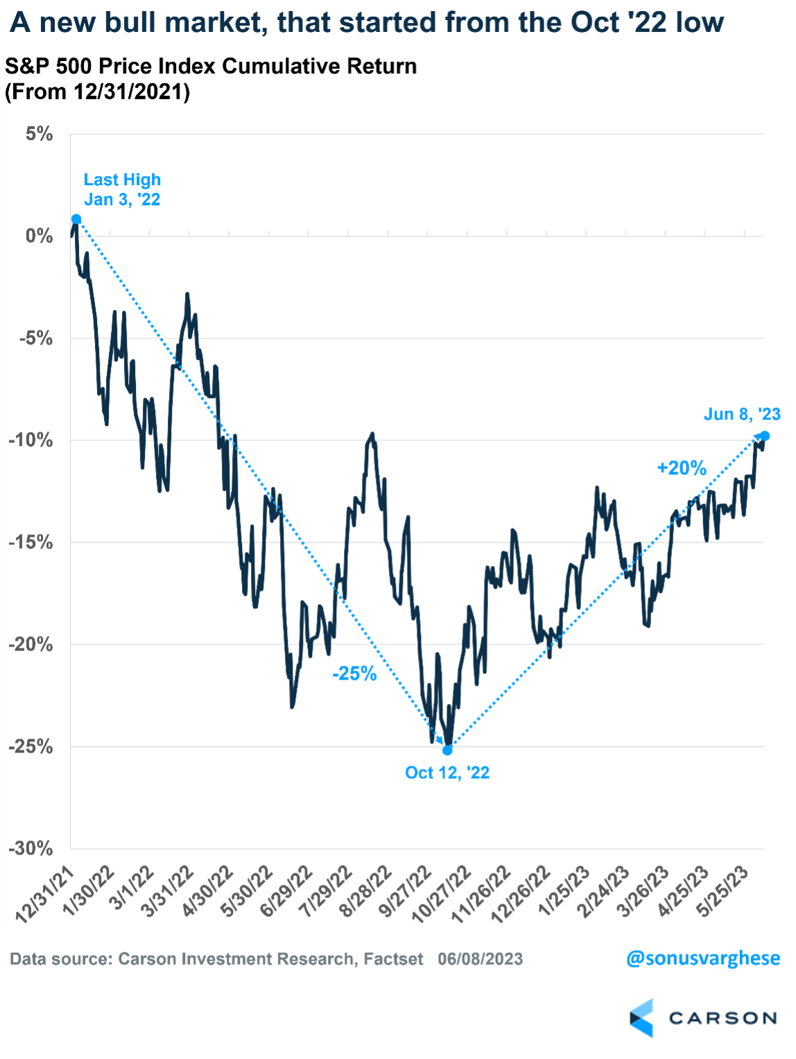 The market’s impressive run off the October lows continued last week. The S&P 500 officially closed up more than 20% from its low set on Oct. 12. In the face of continued skepticism, stocks have progressively moved higher. Now with stocks up 20%, they have officially entered a new bull market and the 2022 bear is over.