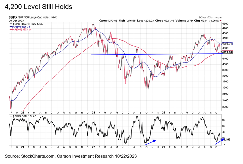 As the chart below shows, the 4,200 level is quite significant and is expected to hold as support. With prices slightly lower than they were in early October, it is worth noting that more stocks are above their 50-day moving averages, a sign of potential strength under the surface. In fact, we saw a similar set-up last October, as prices made new lows but not as many stocks broke down.