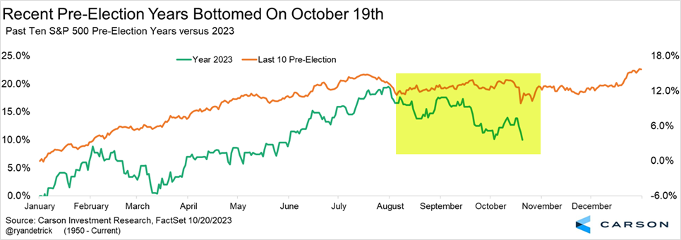 October is known for extreme volatility, but it is also known for ending bear markets and corrections. Interestingly, many bear markets end later in the month, which could happen again. In the last 10 pre-election years since the early 1980s, stocks bottomed on Oct. 19 on average. With various signs of extreme negative sentiment and oversold market levels, we’d place the odds quite high for another late-October low.