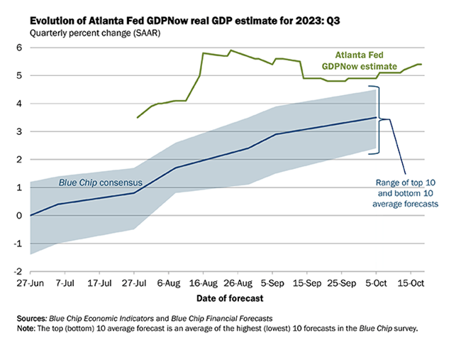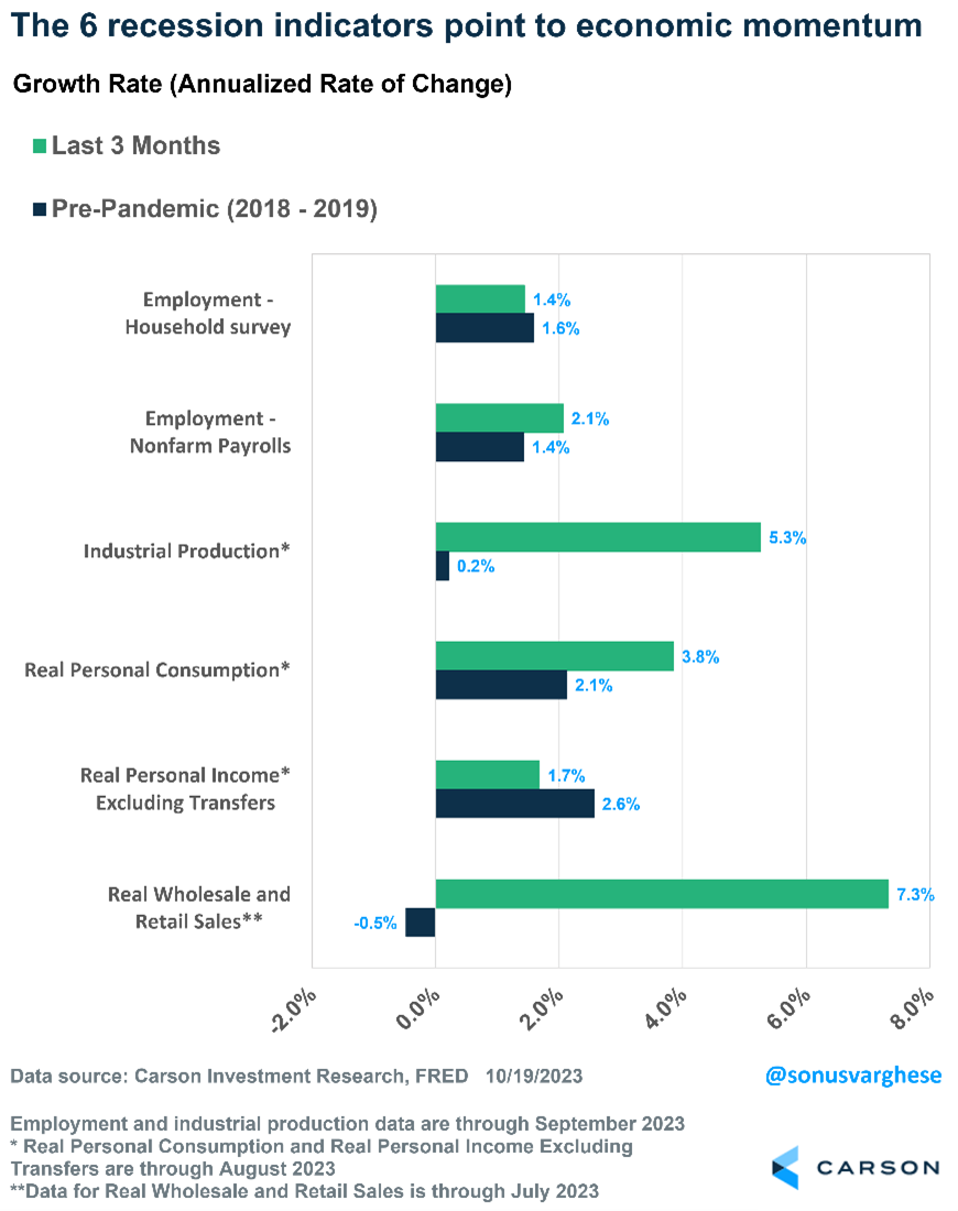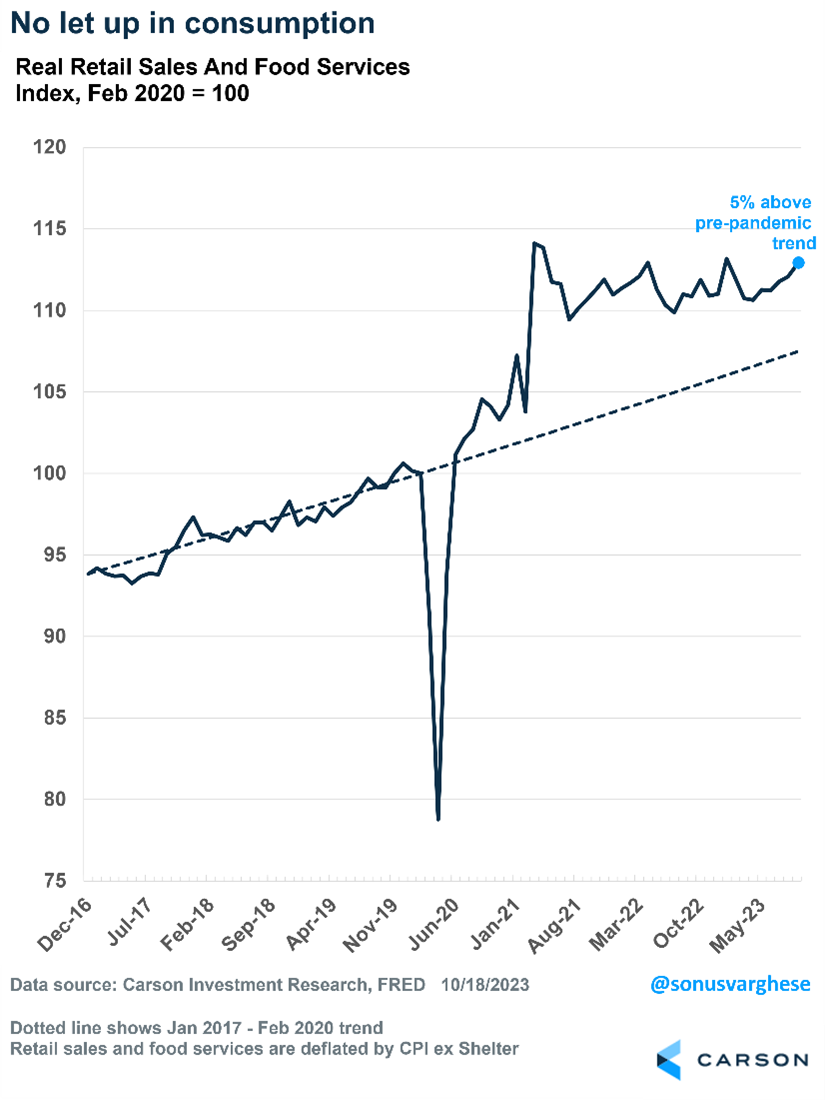 At Carson, we have consistently believed the economy is resilient and will avoid a recession. But at this point, it’s time to call a spade a spade: the economy is not just resilient, it’s running hot. Now it’s unlikely to get close to 5% going forward, but even half that pace is pretty good considering the massive headwind of unprecedented rate hikes by the Federal Reserve.