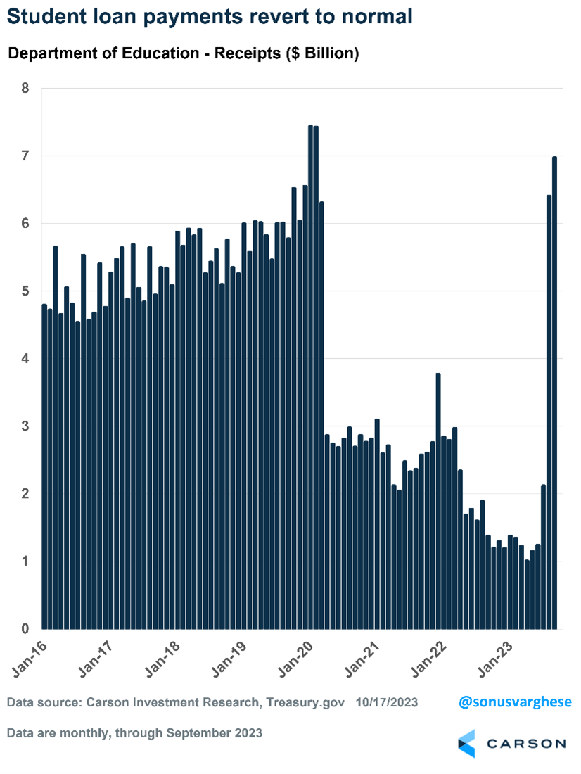 The consumption numbers quoted above came amidst surging student loan payments. I’ve written in the past about how we thought the restart of student loan payments was unlikely to cause a serious dent in the economy. Payments officially restarted in October, but borrowers clearly looked to get ahead of them. Payments jumped from an average of $1.2 billion per month over the first six months of the year to $2.1 billion in July, $6.4 billion in August, and $7 billion in September, according to the U.S. Department of Education. The last two months have exceeded the monthly average of $6 billion from 2019. In fact, the New York Fed analyzed a survey that included student loan borrowers and found that payment resumption would have only a small 0.1%-point impact on consumption relative to August. Many borrowers expected to enroll in new, more generous, income-driven repayment plans. Several borrowers also began adjusting their savings and consumption decisions after learning that payments would resume. It doesn’t look like any of this has adversely impacted consumption in a significant way.