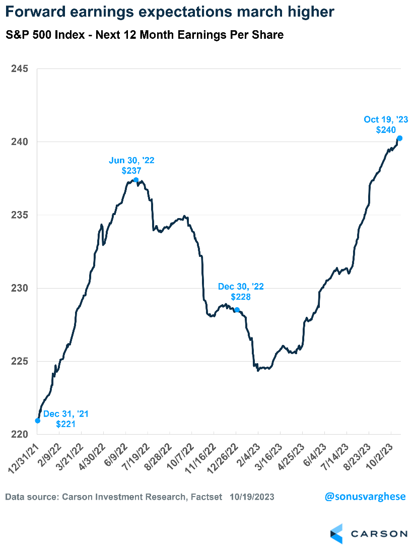 Yes, interest rates are rising, but we believe the market is pricing in a stronger economy in the future. That means the Fed will have to keep rates higher for longer. The market is currently treating that as bad news, but a stronger economy ultimately translates to greater profits. In fact, 12-month forward earnings estimates for the S&P 500 continue to hit new highs. That’s a good thing as far as we’re concerned.
