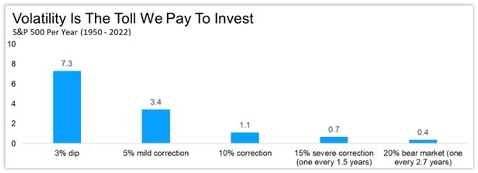 Remember, even good years exhibit some volatility, so it’s important to be prepared to weather the market’s normal ups and downs. A 5% pullback in stocks has historically occurred three or four times per year, while a 10% correction occurs at least once per year. A 20% bear market has historically occurred once every three years.
