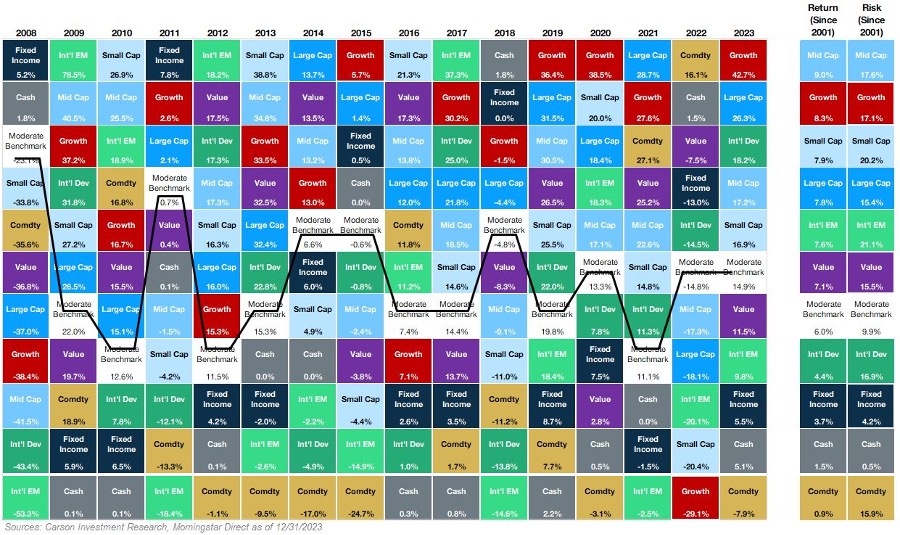While reviewing performance of the past year can be informative for investors, zooming out and taking a longer-term view is even more important. The chart below is our version of the industry staple Quilt Chart of asset class returns. We use the asset classes that make up our internal benchmarks (adding commodities), which also function as a neutral starting point for portfolio construction. We also include our moderate risk level benchmark (60% equity/40% bond target).