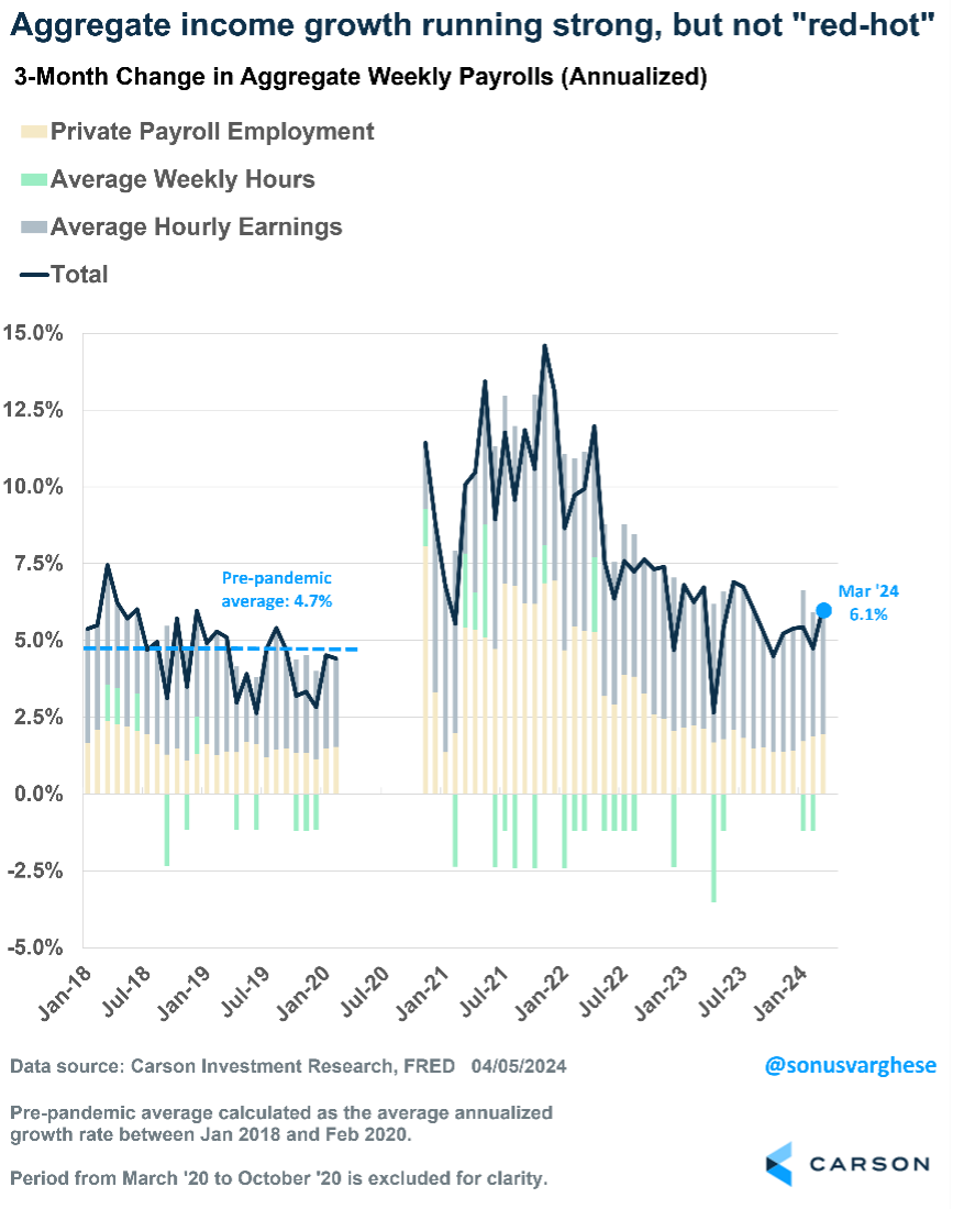 Overall income growth across all workers in the economy (a product of employment growth, hourly wage growth, and hours worked) has run at a 6.1% annualized pace over the last three months. That’s stronger than the pre-pandemic rate, when aggregate income growth averaged about 4.7% annualized, but well off the red-hot levels of 10%+ in 2021-2022 when inflation surged.
