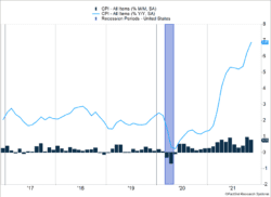Core inflation is also increasing but at a more moderate pace. Food and energy price increases accounted for roughly half the jump in headline CPI last month. Removing those two segments led to a smaller increase for core inflation. Price hikes for reopening items increased last month. New and used vehicles, airline fares, hotels, and shelter costs all rose more than the 0.5% increase in the core index.