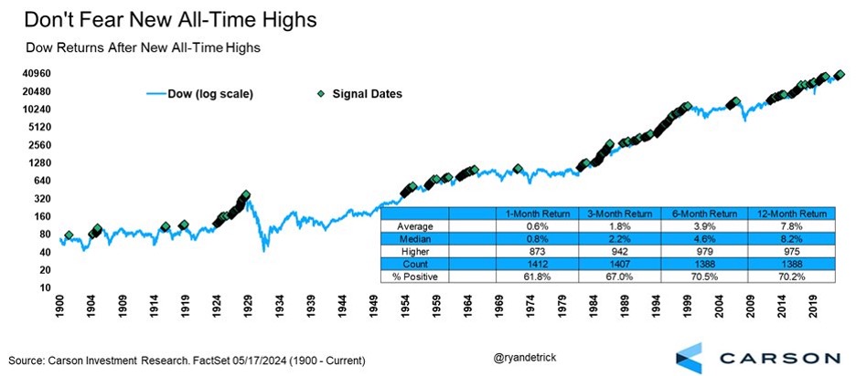 A major milestone was hit last week, as the Dow Jones Industrial Average closed above 40,000 for the first time. While there isn’t much difference between 40,000 and 39,999, it is quite significant from a psychological perspective. Despite numerous analysts predicting an imminent recession and near-certain bear markets, we at Carson pushed back against those false narratives all year. Unfortunately, many investors did not and missed out on record gains.