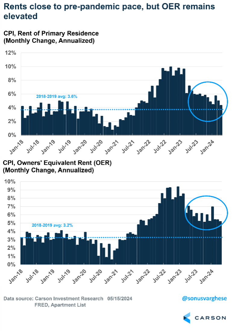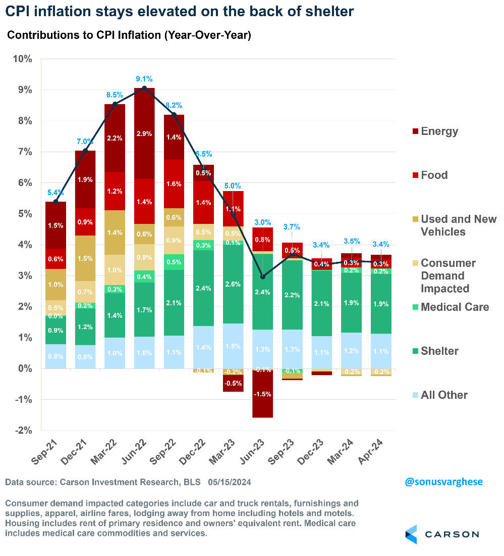 The April CPI report confirmed there was no need to panic after the hot inflation data in the first quarter. Headline inflation rose 0.3% in April, below expectations. On a year-over-year basis, CPI eased to 3.4%. That’s still elevated, but as the chart below shows shelter inflation (dark green bars) is the main cause. When shelter is excluded, headline CPI has risen 2.2% since last April.