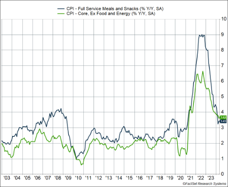 Inflation for restaurant meals has eased significantly over the past year and a half. It peaked at 9% year over year in August 2022 but is now running at 3.4%. That’s similar to the pace of 2019. The message is that underlying inflationary pressures are quite benign. The chart below shows that it’s unusual for inflation of full-service meals (blue line) to run below core CPI inflation (green line), as is the case now. But that’s only because shelter inflation is elevated.