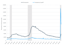 - Permanent job losses remained static, and temporary layoffs shrank to 56% as the service sector hired 1.4 million workers.