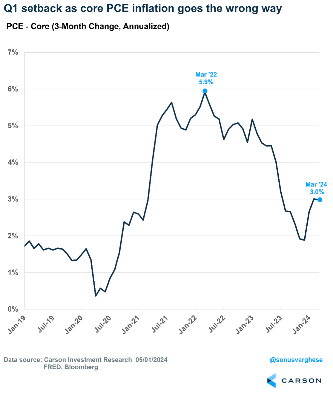 There’s no question that inflation ran hot in the first quarter, especially relative to the second half of 2023. From the chart below, it appears inflation progress has stalled, with the Fed’s preferred inflation metric, the Personal Consumption Expenditures Index (PCE), running at 2.5-3% since December. Core inflation, which strips out volatile food and energy components, has been going the wrong way. Over the last six months, core PCE has run at an annualized pace of 3.0%, and over the last three months it has been up to 4.4%.