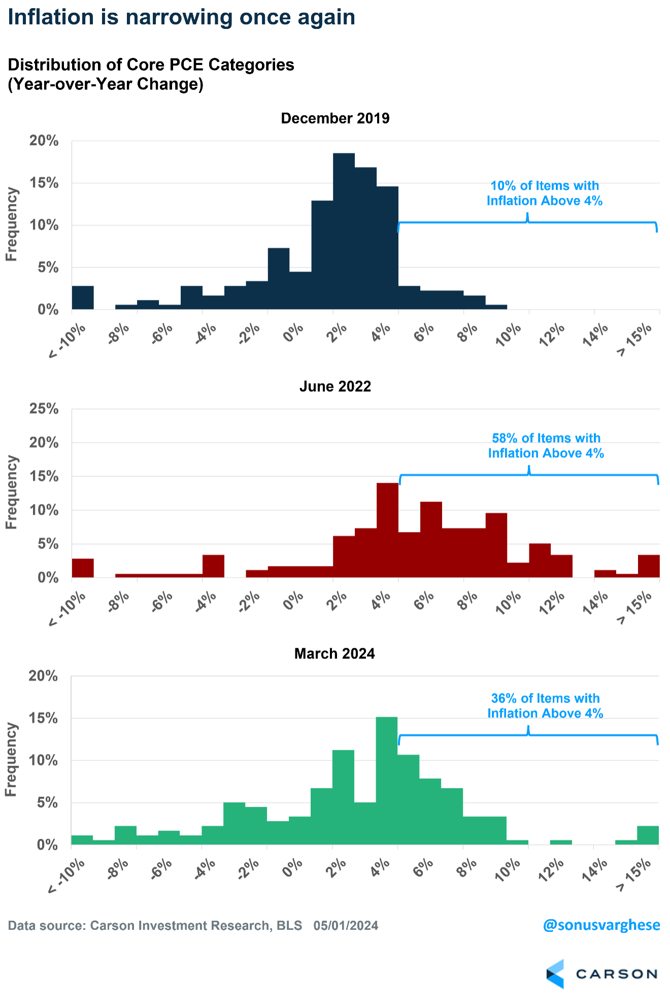 The overall inflation numbers, including for core inflation, can hide what’s happening beneath the surface. To illustrate this, we reviewed all 178 categories within core PCE inflation and calculated the distribution of year-over-year inflation over different periods. It’s clear how inflation broadened out in June 2022 relative to December 2019. Encouragingly, the distribution is narrowing once again. The picture for March 2024 looks closer to what it did in December 2019, rather than June 2022.