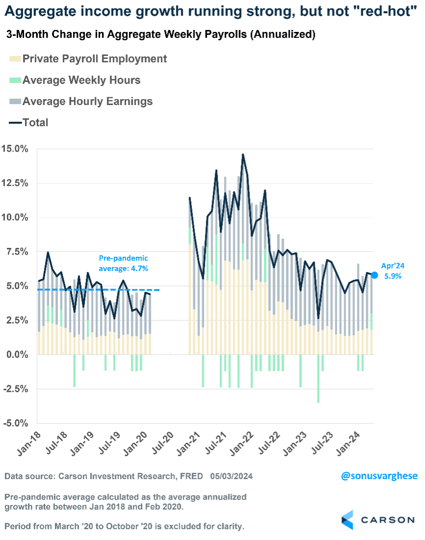 Perhaps the best evidence is aggregate income growth across all workers in the economy. Ultimately, income growth drives consumption, and aggregate income growth is the sum of employment growth, wage growth, and the change in hours worked. Over the last three months (through April), overall income growth has grown at an annualized pace of 5.9%. That’s strong and above the pre-pandemic pace of 4.7%, but it’s far from red hot.