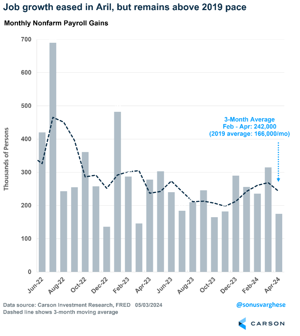 The April employment report was the first one in months that went well against market expectations. Three blockbuster payroll reports in the first quarter had conditioned sentiment toward expecting more of the same, but instead we got something more lackluster. Payrolls grew 175,000 in April — below expectations of 240,000 and lower than the red-hot Q1 monthly average of 269,000. This shifts the narrative from a no-landing scenario to soft landing, i.e., a steady economy with inflation falling, which would allow the Federal Reserve to cut interest rates.