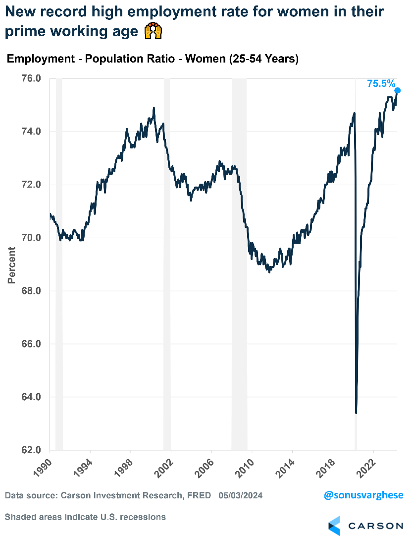 The unemployment rate did tick up from 3.8% to 3.9%, but April is the 27th month in a row in which the unemployment rate has clocked in below 4%. That’s the longest streak since the 1960s. As mentioned previously, the prime-age (25-54 years) employment-population ratio gets around definitional issues that crop up with the unemployment rate (a person is counted as being unemployed only if they’re “actively looking for a job”) or demographics (an aging population with more people retiring and leaving the labor force every day). The prime-age employment population ratio rose in April to 80.8% — that’s only slightly below the high from last summer and above anything between 2001 and 2019, when it peaked at 80.4%. In fact, the prime-age employment population ratio for women just hit an all-time high of 75.5%. This by itself suggests the labor market is strong, as more people are participating in it.