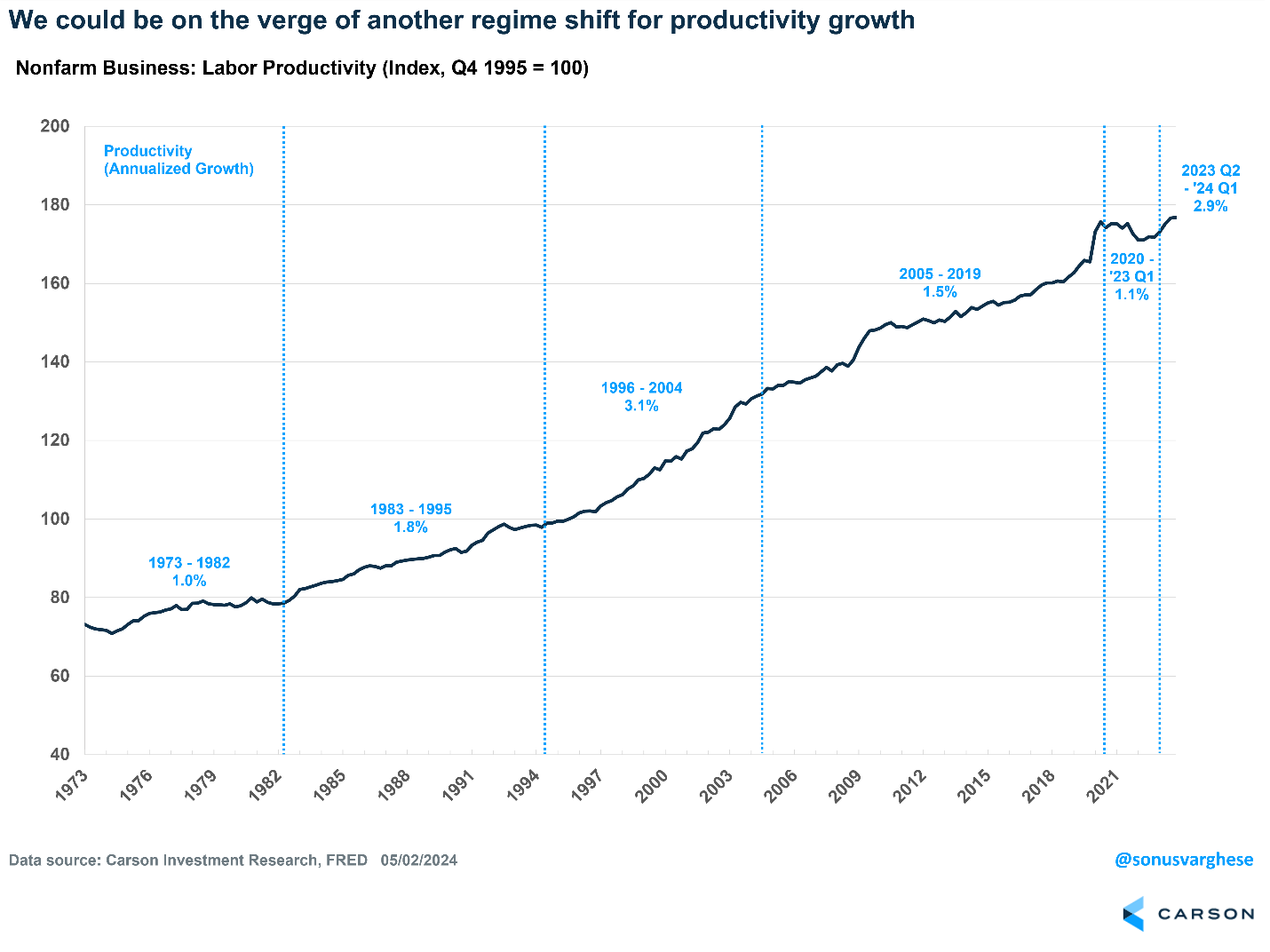 A theme of our 2024 Outlook is a possible resurgence in productivity growth. Over the last year, productivity grew 2.9%. That is well above the 1.1% annualized pace between the first quarter of 2020 and the first quarter of 2023, or the 1.5% annual pace between 2005 and 2019.