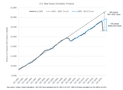 This measure understates the damage by ignoring the fact that the economy would have likely grown without the pandemic and ensuing recession. Figure 2 seeks to overcome this challenge by measuring GDP relative to the recent economic growth trend. The economy is now 11% below its 2009-2019 growth trend.