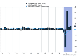 U.S. GDP surged 6.4% in the first quarter. The U.S. annualizes its GDP data, basically assuming the growth rate in the last quarter will continue for a full year. This means a 1.6% actual gain becomes a 6.4% increase in the report.