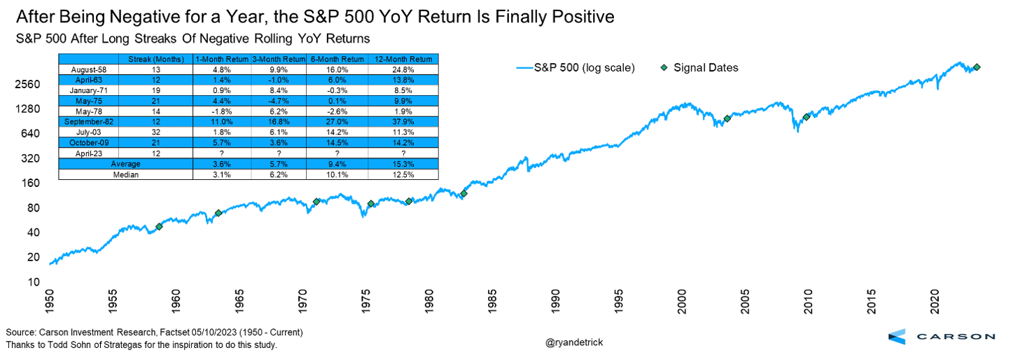 Stocks just turned positive on a year-over-year basis as of the end of April. This matters as the S&P 500 had a negative year-over-year return for 12 months in a row before finally turning positive last month. We reviewed previous examples of the stock market going at least 12 months with negative year-over-year returns, and sure enough the future returns could have the bulls smiling. A year later, stocks were up every time and gained more than 15% on average.