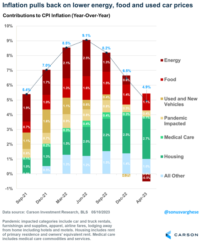 • Energy, food, and used car prices have pulled inflation down from 9% in June 2022 to 4.9% in April 2023.