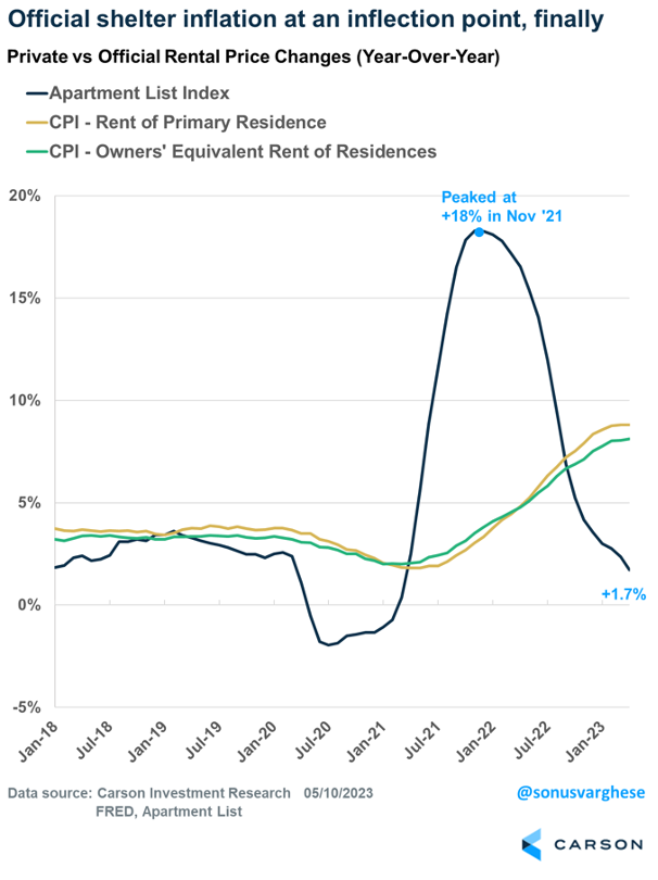 This is in sharp contrast to market-based rental price measures, which have shown a sharp deceleration in rents over the past year. Apartment List’s national rental index peaked at 18% about 18 months ago, but that has decelerated to a 1.7% pace as of April. The official shelter index clearly has a significant lag to this market-based index. But here’s the good news: The official data looks to be at a turning point.