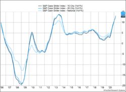 U.S. home prices continued to march higher. As Figure 1 shows, they have surged 13.2%. The 20-city index has increased slightly more as cities just out of the top 10, such as Phoenix, San Diego, and Seattle have experienced very rapid price appreciation. The annualized gains are in line with the 2013 peak as housing prices recovered after the financial crisis. During that rally, the 10- and 20-city indexes experienced more rapid gains than the overall index, indicating smaller cities and towns didn’t participate at the same rate. In this rally, the move toward smaller towns has boosted the national index above the 10-city index.