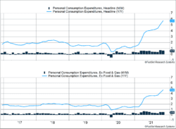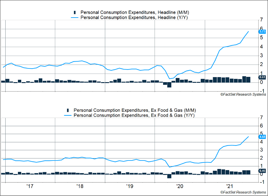 - The personal consumption expenditures (PCE) price deflator rose 0.6% and is up 5.7% in the last 12 months. The annual increase in the PCE inflation rate is the highest since 1982.