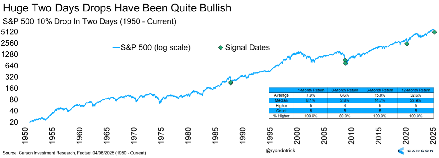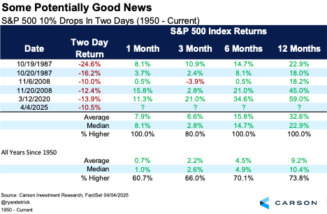 We will discuss our take on the tariffs and economic fallout below, but we know stocks didn’t like the news. In fact, the S&P 500 fell more than 10% on Thursday and Friday, something that last happened in March 2020 and the Great Financial Crisis (GFC) before that. If there is any silver lining to what happened late last week, it is that after previous 10% drops in two days, stocks have done quite well going forward, to the tune of never lower one, six, or twelve months later.