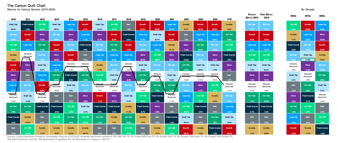A diversified portfolio at an appropriate risk tolerance remains the best path in this kind of environment. That’s the kind of portfolio that makes it easy to make good decisions during periods of market stress. As shown in one of our favorite charts below, different assets may be the winners or losers across different years or even decades, but a diversified holding is a good starting point for avoiding extremes. We take a closer look at potential ways to add diversification in this environment after taking a closer look at the economics of the new tariff policy.
