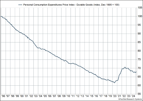 It also gets to the point that these tariffs have several incompatible goals. On the one hand, the goal is to bring back manufacturing to the US. Let’s be clear, this would happen by import substitution, i.e. making foreign goods much more expensive and forcing Americans to buy slightly less expensive US goods (but still more expensive than current prices). Keep in mind that this has major implications for household consumption, especially durable goods (like cars, furniture, appliances, TVs, etc.). The last 30 years, following NAFTA and China’s entry into the WTO in 1999, saw a steady pullback in durable goods prices (the chart shows the personal consumption expenditures index for durable goods). Covid broke that streak, as supply chains cracked, but over the last two years, it was looking like the downtrend in prices resumed. But now, the goal is to willfully break those same supply chains, which means we could be at the end of an era of durable goods deflation.