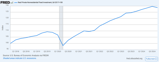 Real private nonresidential investment, i.e. business investment, was already slowing in Q4 2024 before this shock. Companies holding back on new investment is going to be a bigger drag on GDP going forward. Now, we did have a trade war in 2018 – 2019 and didn’t see a big collapse in business investment but that time had two things going for it: 1) a huge corporate tax cut, and 2) a Federal Reserve that started to reverse tight policy. That’s not the case today.