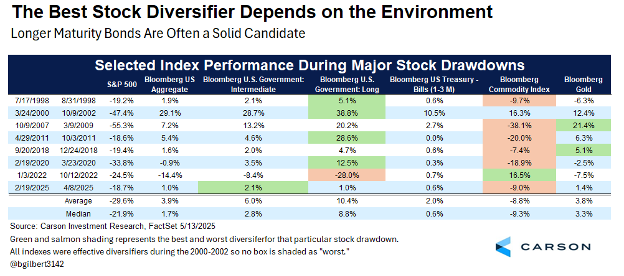 We’ve shared the table below a few times now. It shows which diversifiers worked (or didn’t) in major drawdowns since 1998’s 19.2% S&P 500 decline. What’s worked best has depended on the market environment. Most generally, bonds have fared well and commodities have fared poorly in downturns, but sometimes it’s been dramatically different. (It makes sense that commodities have underperformed — stock downturns often happen during periods of economic weakness, when lower demand weighs on commodity prices.)