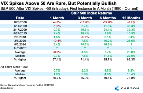 April 8: “The VIX soared to above 60 yesterday morning, hitting levels that historically have marked major bottoms for stocks. We’ll keep this simple, but when the VIX hits 50 for the first time in a month it has probably been preceded by poor performance driven by panic, likely suggesting better times are coming. In fact, the S&P 500 has gained more than 20% on average a year later after the VIX spikes above 50.”
