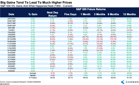 April 16: “Stocks were flirting with a bear market until President Trump put a pause on all reciprocal tariffs (excluding China) for 90 days on Wednesday, April 9. The S&P 500 responded by gaining 9.5% in one day, the third best single day since World War II. Like a beach ball under the water, once it gets some momentum, it can really start moving. In fact, we found 23 other times (since 1950) the S&P 500 gained more than 5% in one day and the future returns were quite impressive longer term, with stocks up a year later more than 91% of the time and up nearly 27% on average.”