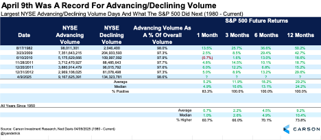 April 16: “It wasn’t just that last Wednesday saw huge gains. Nearly all the volume on the NYSE was for stocks moving higher as well (something we call a buying thrust). In fact, advancing volume was 98.6% of the total volume, the most in history (using reliable data back to 1980). We found six other times that had extreme levels and the S&P 500 was higher 3-, 6-, and 12-months later every single time. Check out some of those dates. August 1982 and March 2009 really stand out as some historic buying opportunities. This could be another clue that the sellers scared by currently known risks have exhausted themselves and higher prices over the intermediate term could be possible.”