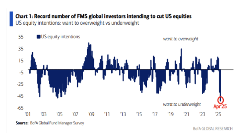 April 22: “The recently released Bank of America Global Fund Manager Survey showed a record number of participants who intend to cut US exposure, as shown in the chart below. The survey also showed the largest two-month jump in cash since April 2020 and the 4th highest recession expectations ever. Given this survey looks at managers who manage actual portfolios, this is a very solid potential contrarian indicator.”