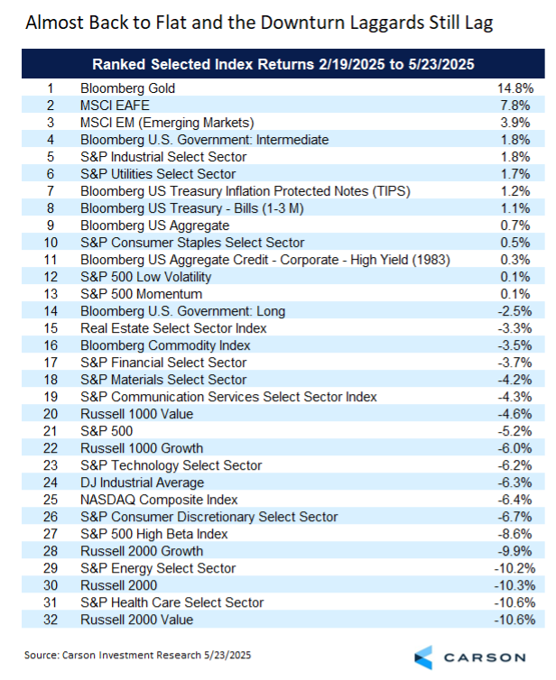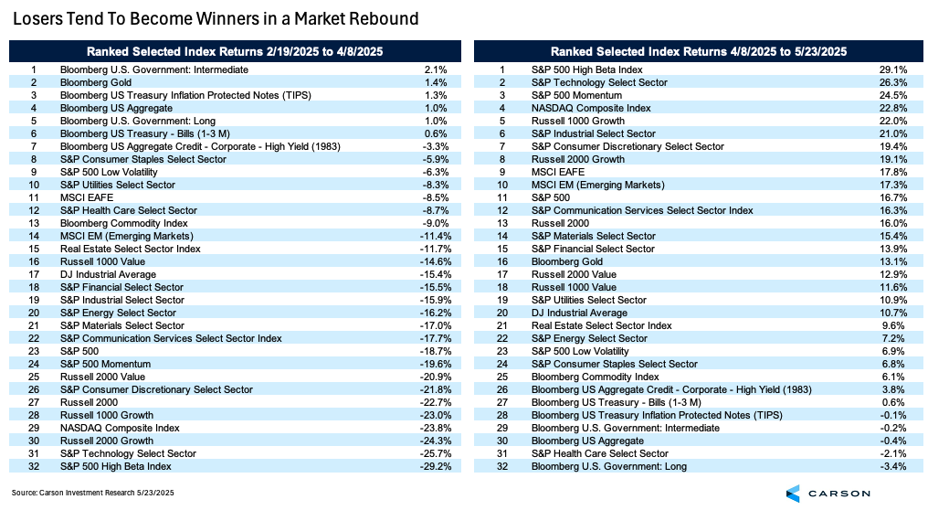 This is more a short-term observation. It took a long time for tech to come back from the tech bubble bursting and for financials to come back from the Great Financial Crisis. But during the immediate rebound from a selloff, the losers in the selloff can often be the winners in the rebound. Below are charts ranking 32 major indexes during the sell-off and the rebound as of last Monday, 5/19. It includes broad stock indexes as well as stock size, sector, style, and region; a few bond indexes; and a couple of commodity indexes.
